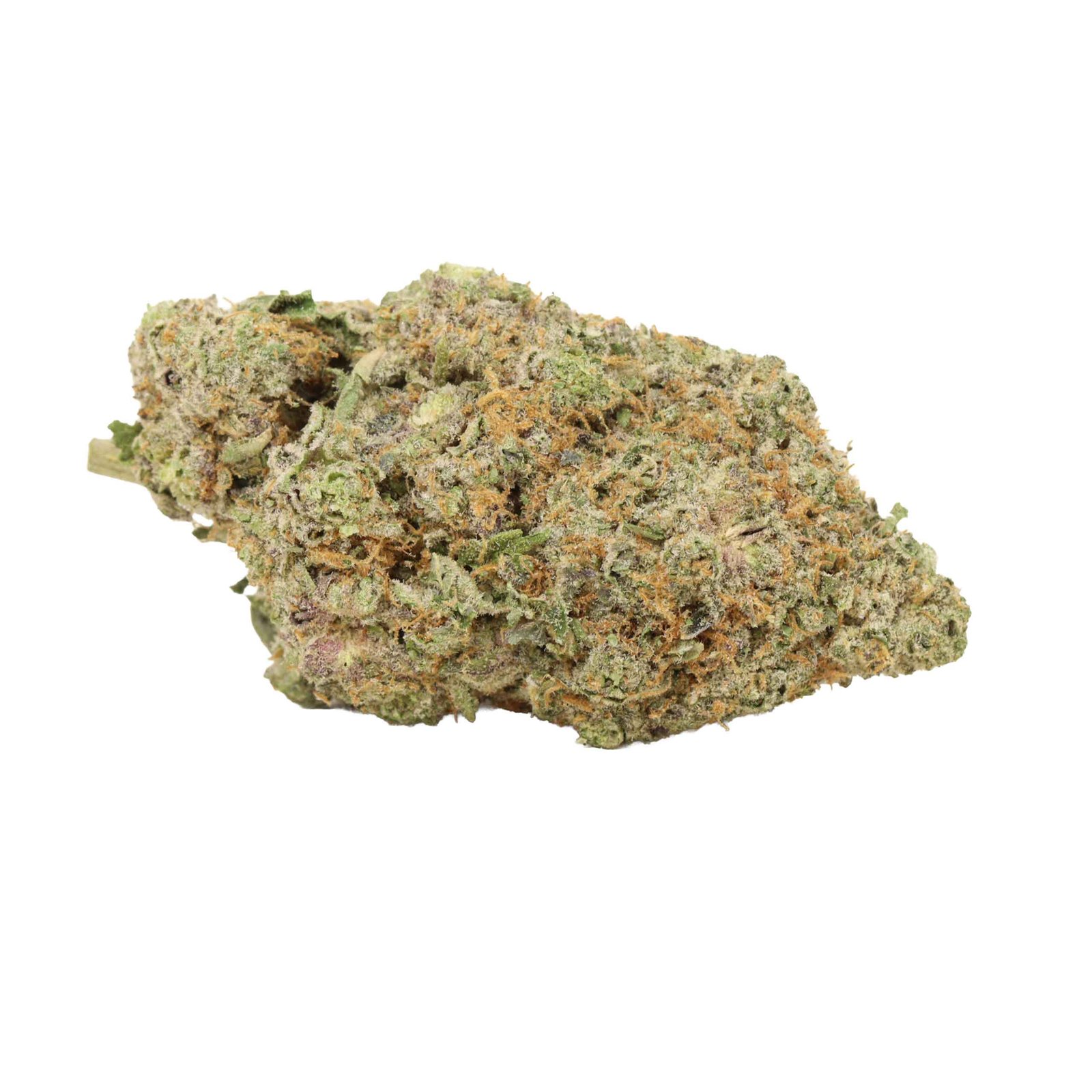 This cannabis strain is packed with forest bright green popcorn-shaped nugs with a lot of bright orange hairs, vivid purple undertones, and a sheen of frosty amber crystal trichomes.