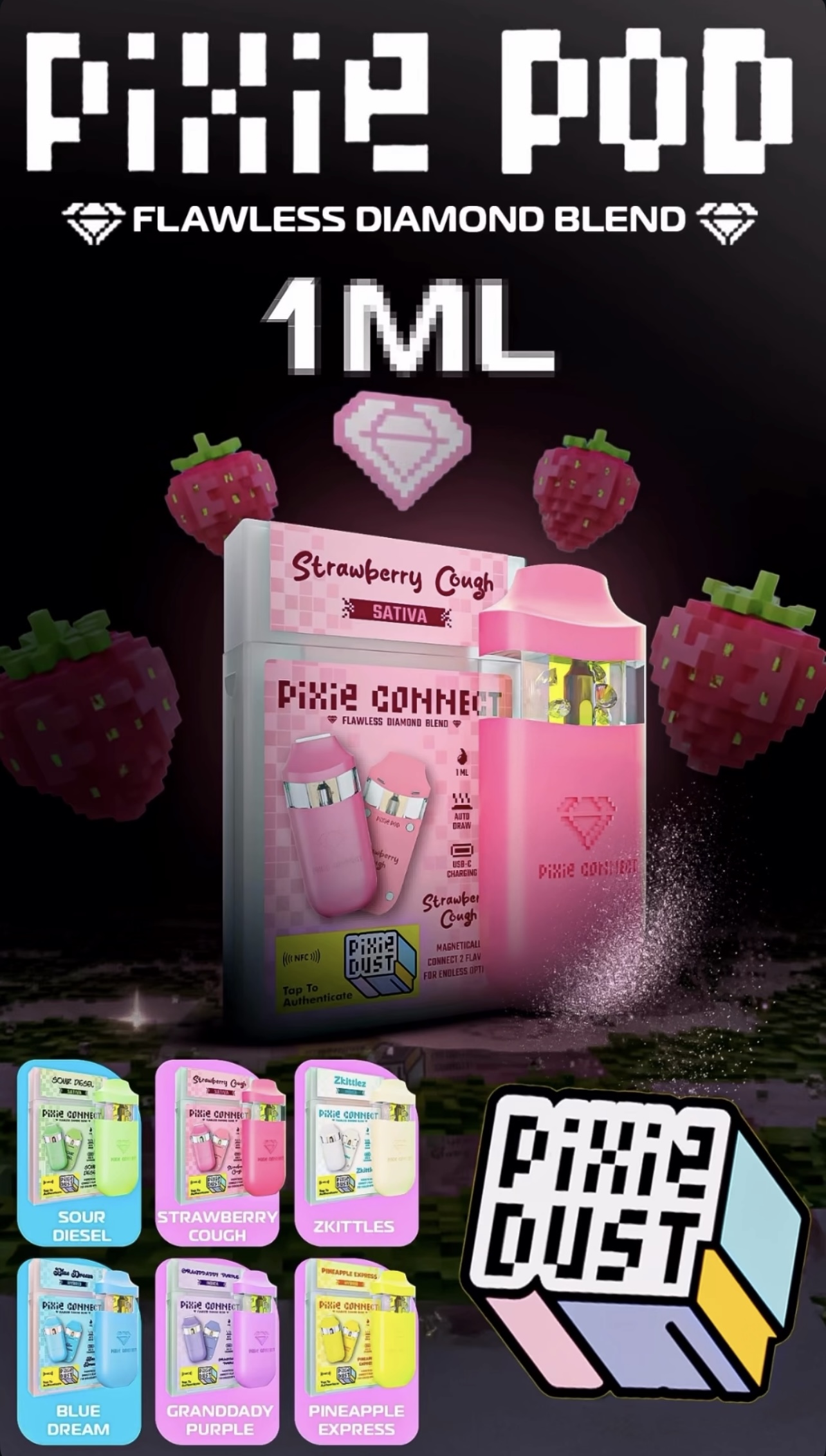 | Flavours | Mix Variety Flavours, Sour Diesel, Strawberry Cough, Granddaddy Purple, Pineapple Express, Zkittles, Blue Dream |